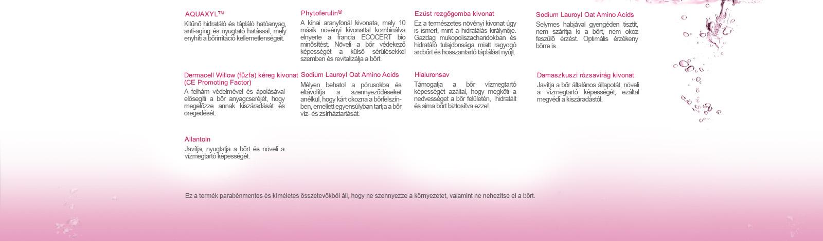 - Aquaxyl: Kitűnő hidratáló és tápláló hatóanyag, anti-aging formulával, mely nyugtatja a bőrt